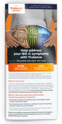 Trulance (plecanatide) 3 mg tablets are indicated in adults for the treatment of Chronic Idiopathic Constipation (CIC) and Irritable Bowel Syndrome with Constipation (IBS-C).